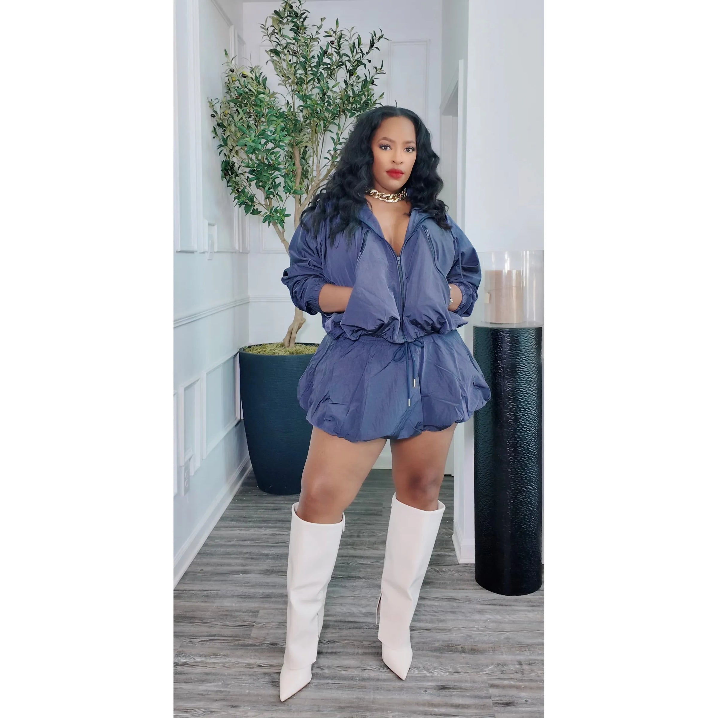 Stay bold in this statement-making set that commands attention. Lightweight nylon construction keeps you comfortable while the full front zipper lets you control your vibe—zip it up or wear it open. Vertical zip pockets keep essentials secure, while the bubble skirt adds an unexpected edge over attached shorts and more pockets. Daring, functional, and unapologetically you. SHIPS OUT WEDNESDAY!